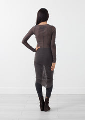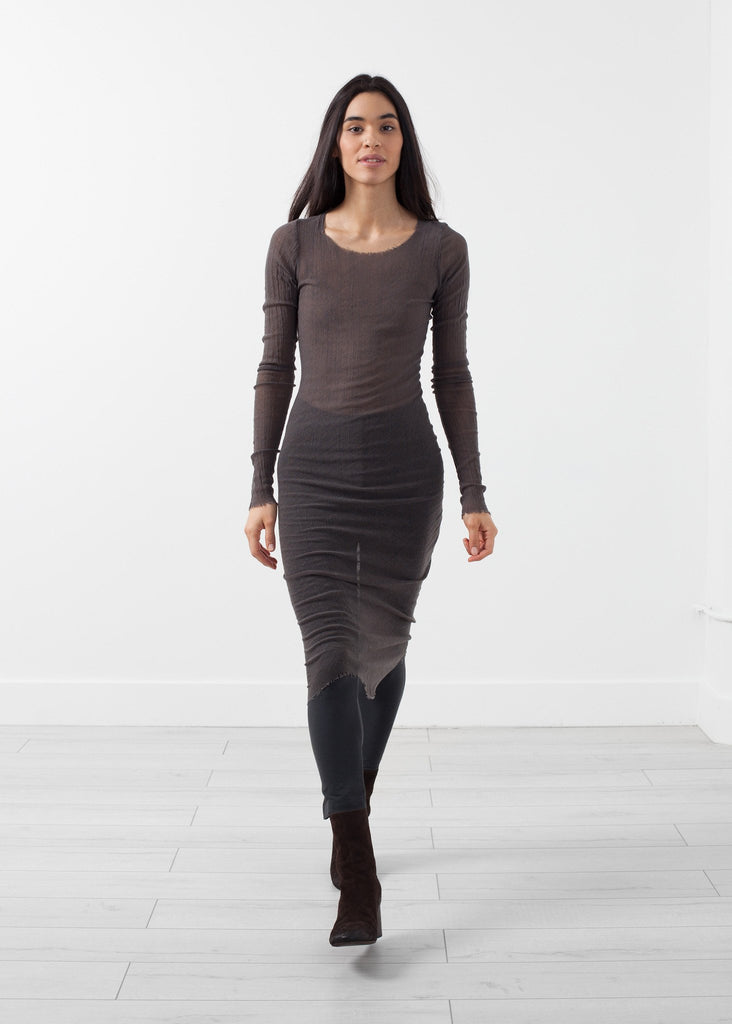 The Sheer Dress offers a slim silhouette with mesh body. Idea for layering or as a stand alone piece. Raw hems. Rundholz. Color Mohne. 55% Wool, 35% Elastane, 10% Polyamide. Made in Germany. Ashley is wearing a Small.