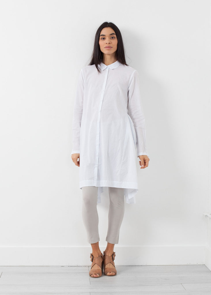The Rundholz Black Label collection emphasizes accessibility in fashion. The Shell Dress is the shirtdress, reimagined. Gathered accsents at sides, pleated details at back waist. Button placket closure at front. Color White. 100% Cotton. Ashley is wearing an X-Small.