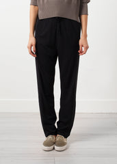 True versatility of pieces, the collection is diverse yet harmonizing with each other. The Alia Knit Trouser by Annette Gortz is essentially a classy sweat pant. Draw string waist band. Side angled pockets at front. Tapered leg with a subtle racing stripe. Color Black. 96% Viscose, 4% Polyester. Made in Germany. Ashley is wearing an X Small.