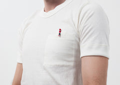 The Interlock Jersey Tee is exceeding in rank of comfort and look. Crew neckline, sleeves to mid bicep, and breast pocket at front left. Nigel Cabourn. Color Natural. 100% Cotton. Made in England. Jacob is wearing a 50.