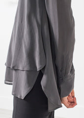 Become enchanted with the Liberty by Lareida. Graceful draping of form guides to its' hinted sensuality. Soft v-neckline, tailored sleeves, and flowing layered hem. Single button closure at center back. Color Asphalt. 92% Silk, 8% Lycra. Made in Portugal. Ashley is wearing a 36.