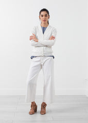 The Lime offers nautical themes with a classic silhouette. Button placket closure at front. Two exterior pockets at front. Yoshi Kondo. Color White. 73% Cotton, 27% Linen. Made in Romania. Ashley is wearing a Medium.