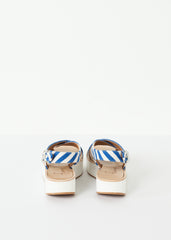 Fun straps paired with bright colors makes the French shoe label Flamingos perfect for summertime. With Anne Blum at its helm, this label effuses creativity in style and just the right amount of play. The Malabar is this summer's platform wedge with a comfortable and whimsical style. Buckle closure. Color Blue/White. 65% Cotton, 25% Acrylic, 10% Polyester straps, synthetic EVA treaded sole. Leather footbed and lining. Made in Spain.
