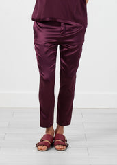 The Silk Pant is a slim pant with slight drop. Elastic waistband for ease. Side angled pockets with coin pocket at front, one exterior pocket at back. Sibel Saral. Color Wine. 94% Silk, 6% Elastane. Made in Turkey. Ashley is wearing an X-Small.