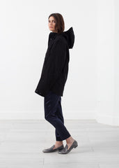Unisex outer-layer to keep you warm and dry. Three button placket at front. Two exterior button pockets. Drawstring waistband. Adjustable hood. Hansen. Color Black. 100% Cotton. Made in EU. Lana is wearing an XSmall.