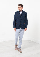 The Fitted Low Rise Trouser is an easy wear for mixing and matching. Straight fitting leg through the ankle. Lined texture adds dimension and tone. Three button closure with zip fly. Four exterior pockets. Berwich. Color Blue/White. 64% Polyester, 33% Cotton, 3% Elastane. Made in Italy. Jacob is wearing a Size 48.