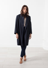 The Woven Pleat Back Coat desired volume to any outfit. Standup collar with lapel. Single breasted button closure. Gianfranco Scotti. Color Navy. Fully lined. 68% Cotton, 32% Viscose. Made in France. 100% Cotton. Made in Italy. Lana is wearing a French 36.